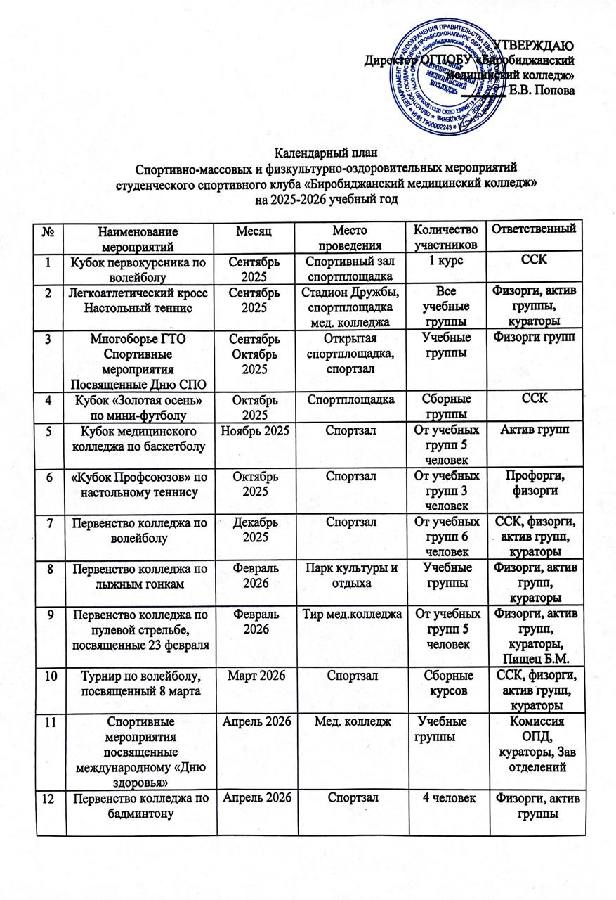 - КАЛЕНДАРНЫЙ ПЛАН спортивно-массовых и физкультурно-оздоровительных мероприятий студенческого спортивного клуба ОГПОБУ "Биробиджанский медицинский колледж" на 2025-2026 учебный год