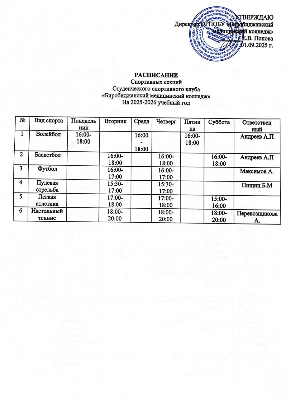 - РАСПИСАНИЕ спортивных секций студенческого спортивного клуба ОГПОБУ "Биробиджанский медицинский колледж" на 2025-2026 уч.год